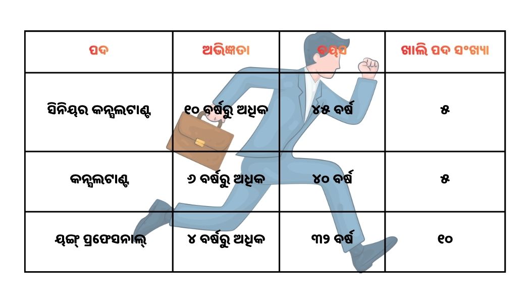 ଅଷ୍ଟମ ବେତନ କମିଶନଙ୍କ ପକ୍ଷରୁ ସିନିୟର କନ୍ସଲଟାଣ୍ଟ, କନ୍ସଲଟାଣ୍ଟ ଏବଂ ୟଙ୍ଗ୍ ପ୍ରଫେସନାଲ୍ ପଦରେ ନିଯୁକ୍ତି ଦିଆଯାଉଛି । ସିନିୟର କନ୍ସଲଟାଣ୍ଟ ଲାଗି ୧୦ ବର୍ଷର ଅଭିଜ୍ଞତା ସହ ସର୍ବାଧିକ ବୟସ ସୀମା ୪୫ ବର୍ଷ ରହିଛି । ସେହିଭଳି କନ୍ସଲଟାଣ୍ଟ ପଦ ଲାଗି ୬ ବର୍ଷ ଅଭିଜ୍ଞତା ଓ ସର୍ବାଧିକ ବୟସ ୪୦ ଏବଂ ୟଙ୍ଗ୍ ପ୍ରଫେସନାଲଙ୍କ ଲାଗି ୪ ବର୍ଷର ଅଭିଜ୍ଞତା ଓ ସର୍ବାଧିକ ବୟସ ୩୨ ବର୍ଷ ରଖା ଯାଇଛି ।