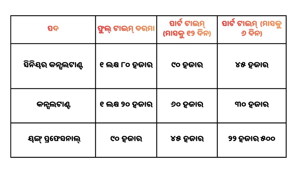 ଦରମା କଥା କହିଲେ ଫୁଲ୍ ଟାଇମ୍ ସିନିୟର କନ୍ସଲଟାଣ୍ଟଙ୍କୁ ମାସିକ ୧ ଲକ୍ଷ ୮୦ ହଜାର, କନ୍ସଲଟାଣ୍ଟଙ୍କୁ ମାସିକ ୧ ଲକ୍ଷ ୨୦ ହଜାର ଏବଂ ୟଙ୍ଗ୍ ପ୍ରଫେସନାଲଙ୍କୁ ମାସିକ ୯୦ ହଜାର ଟଙ୍କା ମିଳିବ । ଏକ ଏକ୍ସପର୍ଟ କମିଟି ଆଶାୟୀଙ୍କ ପ୍ରୋଫାଇଲ୍ ଯାଞ୍ଚ ପରେ ଆଲୋଚନା ମାଧ୍ୟମରେ ଚୟନ କରାଯିବ ।