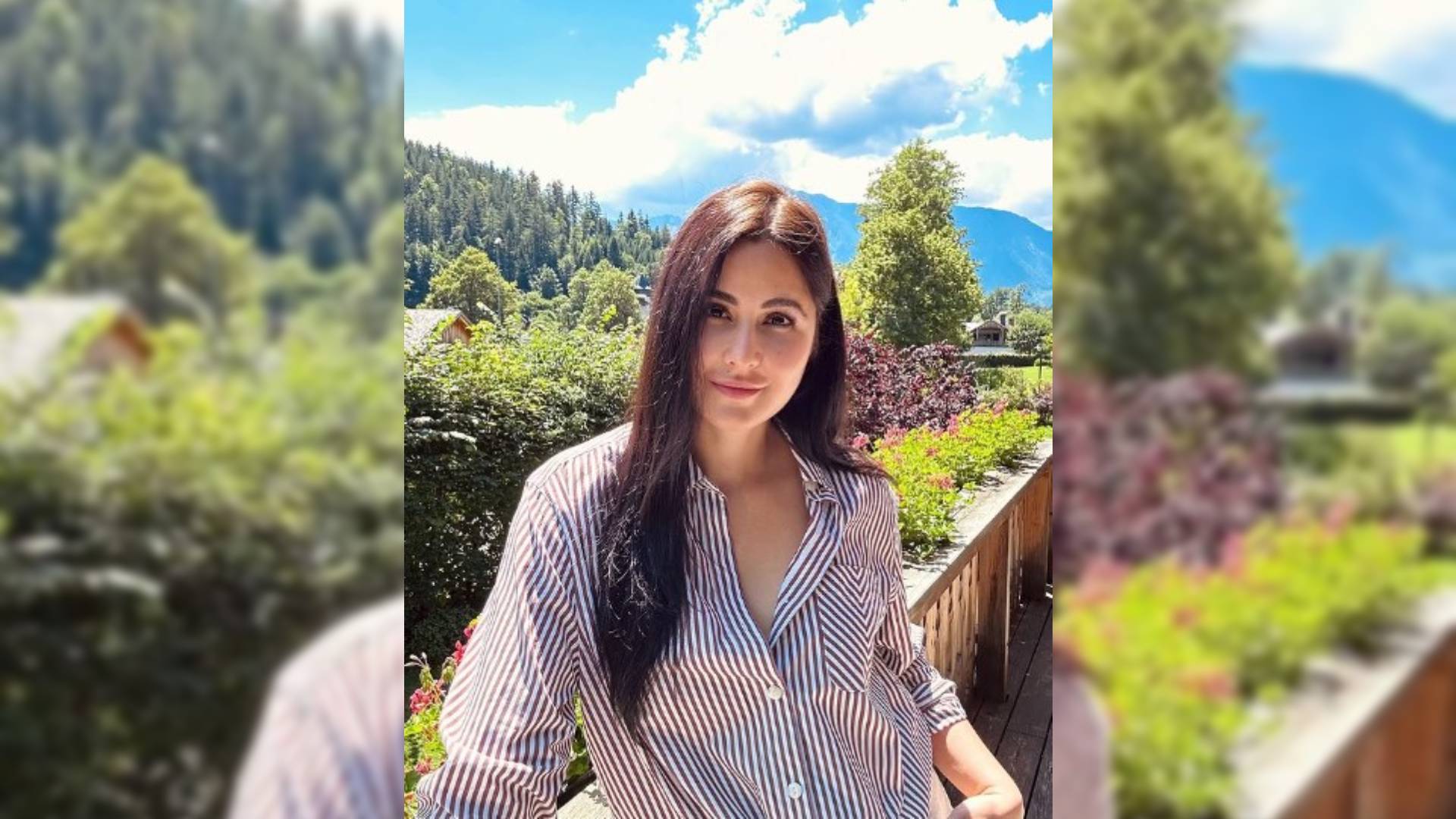 Katrina took to Instagram to post a picture where she is standing on a wooden balcony, dressed in a striped shirt. The sunlight casts a golden glow on her, highlighting her serene expression. The backdrop showcases a beautiful view of the sky and lush greenery.