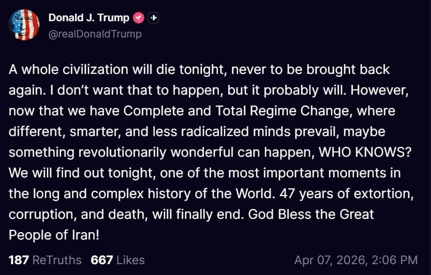ସୋସିଆଲ ମିଡିଆ ପ୍ଲାଟଫର୍ମ ଟ୍ରୁଥ୍ ସୋସିଆଲରେ ସେ ଲେଖିଛନ୍ତି, ଆଜି ରାତିରେ ଏକ ସମ୍ପୂର୍ଣ୍ଣ ସଭ୍ୟତାର ପତନ ଘଟିବ, ଯାହା ବୋଧହୁଏ ଆଉ କେବେ ଫେରିବ ନାହିଁ । ମୁଁ ଚାହୁଁନି ଯେ ଏମିତି ହେଉ, କିନ୍ତୁ ବୋଧହୁଏ ଏହା ହିଁ ହେବାକୁ ଯାଉଛି । ତଥାପି, ବର୍ତ୍ତମାନ ଯେହେତୁ ଶାସନ ବ୍ୟବସ୍ଥାରେ ସମ୍ପୂର୍ଣ୍ଣ ପରିବର୍ତ୍ତନ ଆସିଛି, ଯେଉଁଠାରେ ଭିନ୍ନ, ଅଧିକ ବୁଦ୍ଧିମାନ ଏବଂ କମ୍ କଠୋରପନ୍ଥୀ ମାନସିକତାର ଶାସକ ରହିବେ, ତେବେ ହୁଏତ କିଛି କ୍ରାନ୍ତିକାରୀ ଓ ଚମତ୍କାର ଘଟଣା ଘଟିପାରେ, କିଏ ଜାଣେ ? ବିଶ୍ୱର ଦୀର୍ଘ ତଥା ଜଟିଳ ଇତିହାସର ସବୁଠାରୁ ଗୁରୁତ୍ୱପୂର୍ଣ୍ଣ ମୁହୂର୍ତ୍ତ ମଧ୍ୟରୁ ଅନ୍ୟତମ ହେଉଛି ଆଜି ରାତି, ଯାହା ଆମେ ଜାଣିବାକୁ ପାଇବା । ୪୭ ବର୍ଷର ଜବରଦସ୍ତି ଆଦାୟ, ଦୁର୍ନୀତି ଏବଂ ମୃତ୍ୟୁର ଶେଷରେ ଅନ୍ତ ଘଟିବ ବୋଲି ଟ୍ରମ୍ପ ଧମକ ଦେଇଛନ୍ତି ।