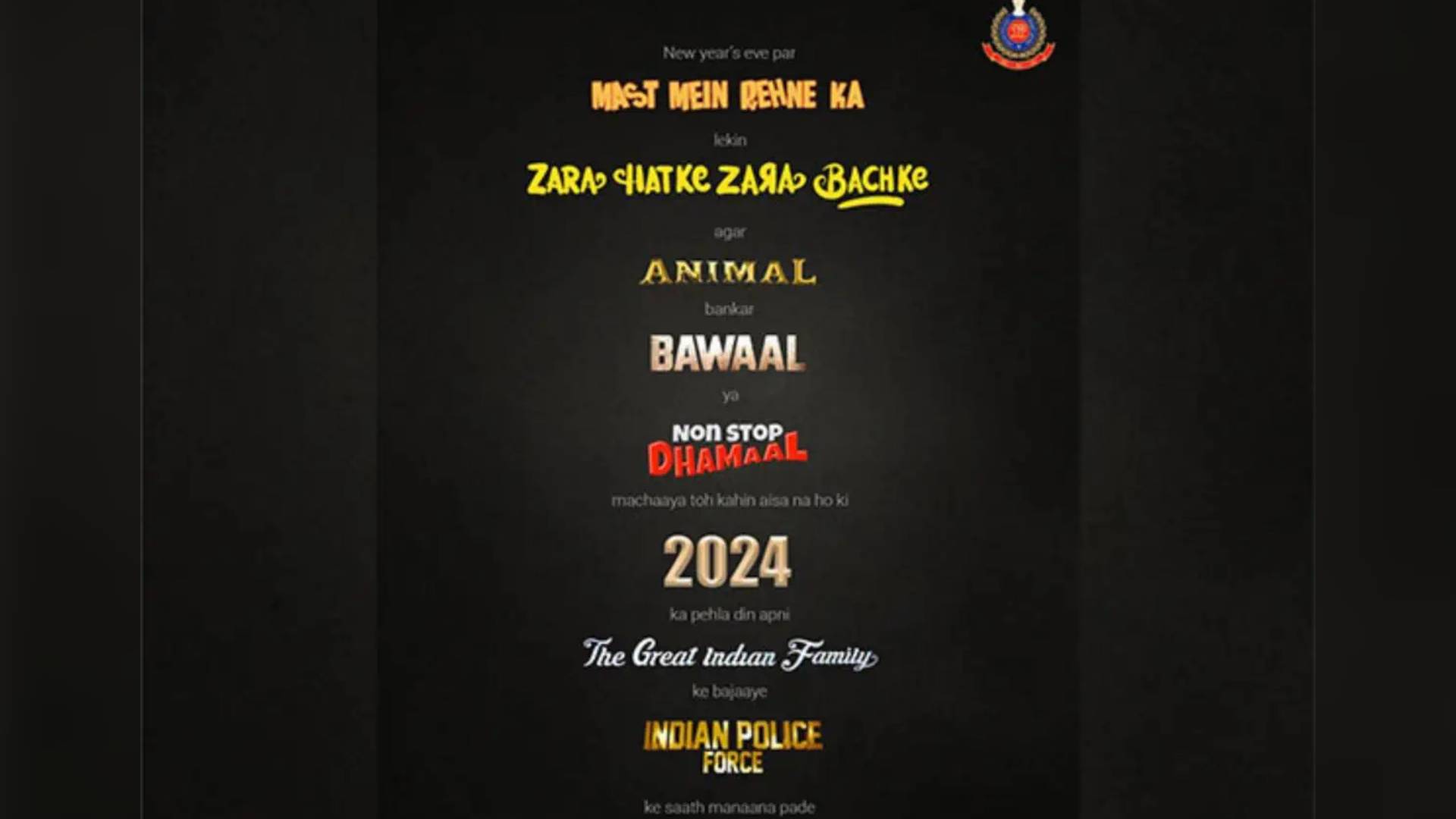 "New Year's Eve par 'Mast Mein Rehne Ka' lekin 'Zara Hatke Zara Bachke'. Agar 'Animal' ban kar 'Bawaal' ya 'Non Stop Dhamaal' machaaya toh kahi aisa na ho ki 2024 ka pehla din 'The Great Indian Family' ke bajaaye 'Indian Police Force' ke saath manana pade," Delhi Police wrote.