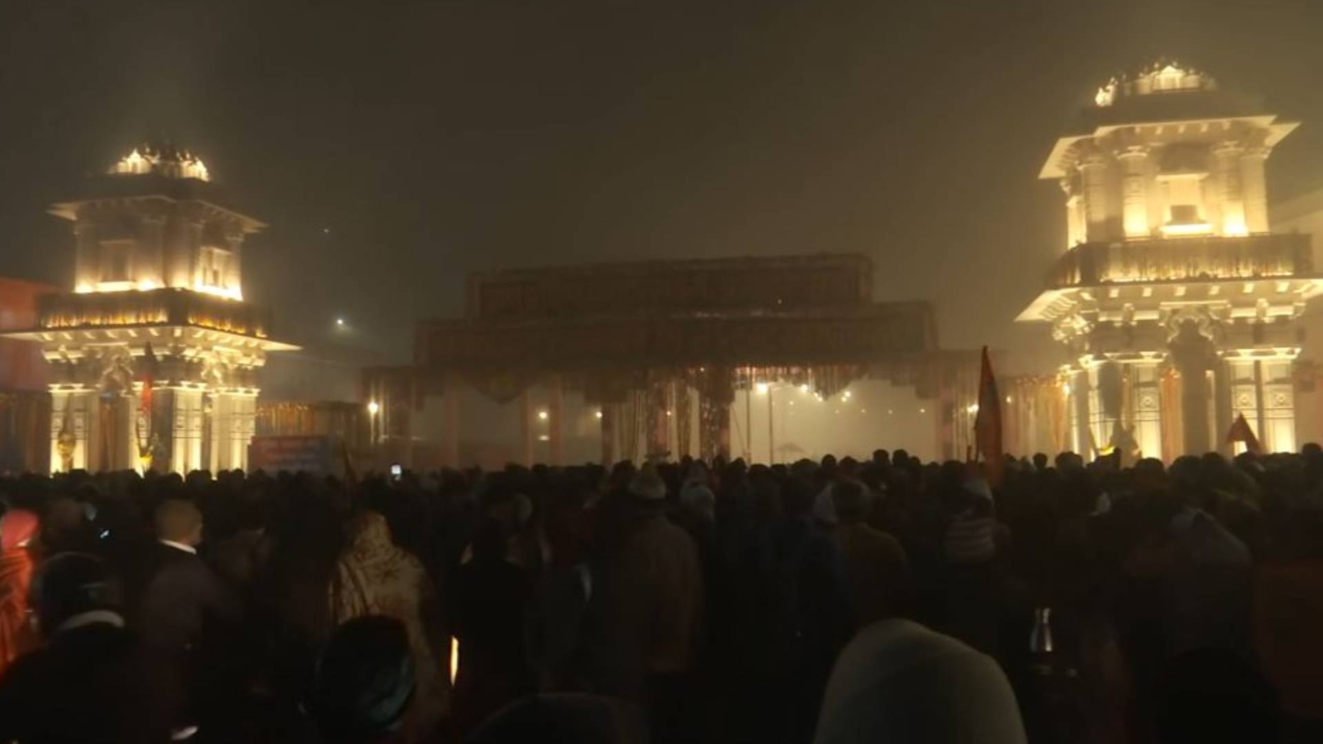 After the 'Pran Pratishtha' ceremony of Ram Lalla that concluded in Ayodhya on Monday, a heavy rush of devotees throng at the main gate of Shri Ram Temple to offer prayers on Tuesday.