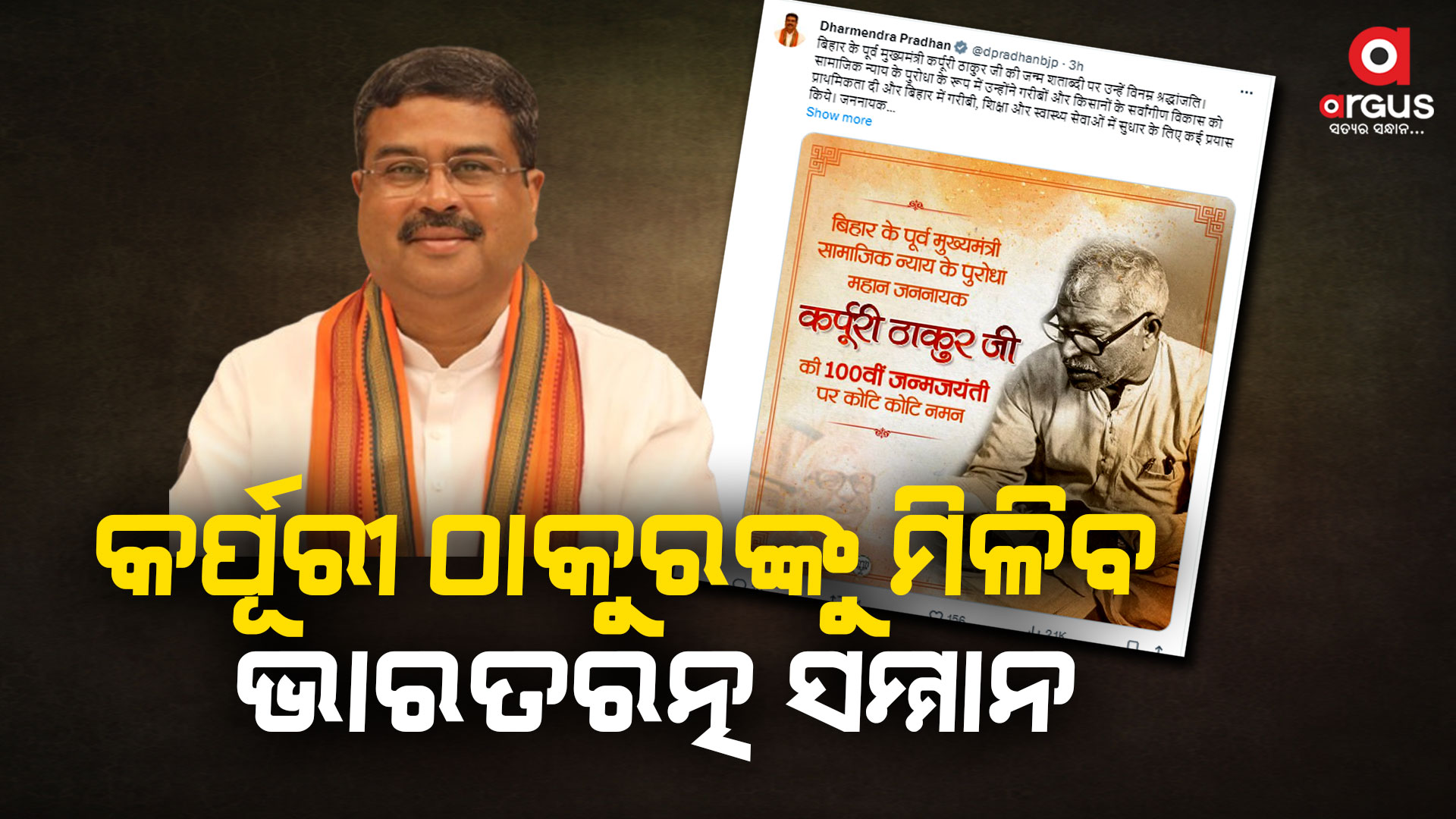 ଅର୍ଗସ ବ୍ୟୁରୋ : ବିହାର ପୂର୍ବତନ ମୁଖ୍ୟମନ୍ତ୍ରୀ କର୍ପୁରୀ ଠାକୁରଙ୍କୁ ମିଳିବ ଭାରତରତ୍ନ ସମ୍ମାନ । ମରଣୋତ୍ତର ସମ୍ମାନ ଘୋଷଣା କଲେ କେନ୍ଦ୍ର ସରକାର । ଆଜି କର୍ପୁରୀ ଠାକୁରଙ୍କ ୧୦୦ତମ ଜୟନ୍ତୀ । ଏହା ପୂର୍ବରୁ ଭାରତରତ୍ନ ସମ୍ମାନ ଘୋଷଣା କରିଛନ୍ତି ମୋଦି ସରକାର । ବିହାରର ୨ ଥର ମୁଖ୍ୟମନ୍ତ୍ରୀ ଥିବା କର୍ପୂରୀ ଠାକୁର ଜନ ନାୟକ ଭାବେ ଜଣାଶୁଣା ।