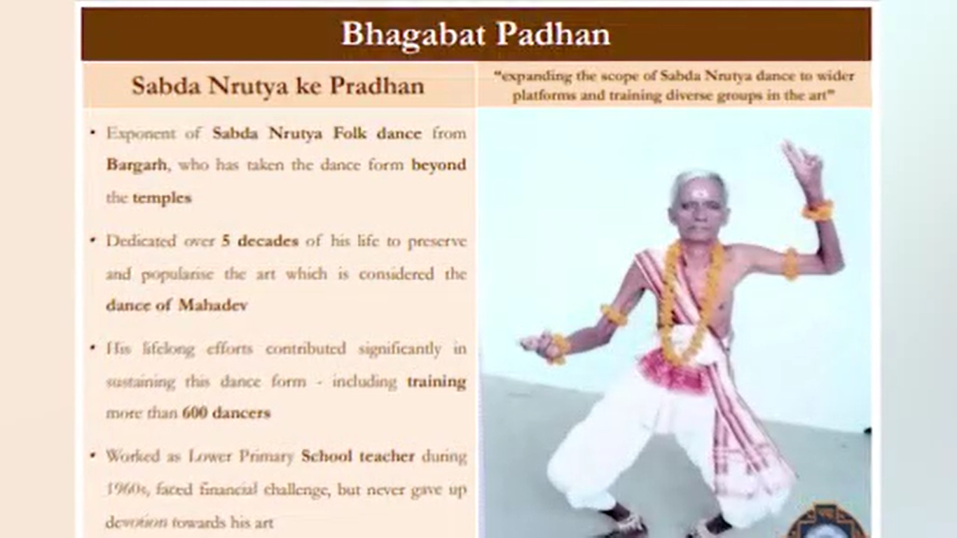 ଅର୍ଗସ ବ୍ୟୁରୋ: ପଦ୍ମ ପୁରସ୍କାର 2024 ଘୋଷଣା। ଓଡ଼ିଶାରୁ 4 ଜଣଙ୍କୁ ପଦ୍ମ ସମ୍ମାନ । ଗଞ୍ଜାମର ଗୋପୀନାଥ ସ୍ବାଇଁଙ୍କୁ କୃଷ୍ଣଲୀଳା ସଂଗୀତ ପାଇଁ ପଦ୍ମ ପୁରଷ୍କାର ମିଳିଛି ।105 ବର୍ଷ ବୟସରେ ଗୋପୀନାଥଙ୍କୁ ମିଳିବ ଏହି ସମ୍ମାନ। ସେହିପରି ବରଗଡ଼ର ଭାଗବତ ପ୍ରଧାନଙ୍କୁ ଶବ୍ଦ ନୃତ୍ୟ ପାଇଁ ମିଳିବ ପଦ୍ମ ସମ୍ମାନ। ବିଶିଷ୍ଟ ପଟ୍ଟଚିତ୍ର ଶିଳ୍ପୀ ବିନୋଦ ମହାରଣାଙ୍କୁ ମହାପ୍ରଭୁ ଶ୍ରୀଜଗନ୍ନାଥ ଓ ଭଗବାନ ବିଷ୍ଣୁଙ୍କ ଉପରେ ପଟ୍ଟଚିତ୍ର ଆଙ୍କିବା ନେଇ ମିଳିବ ସମ୍ମାନ।