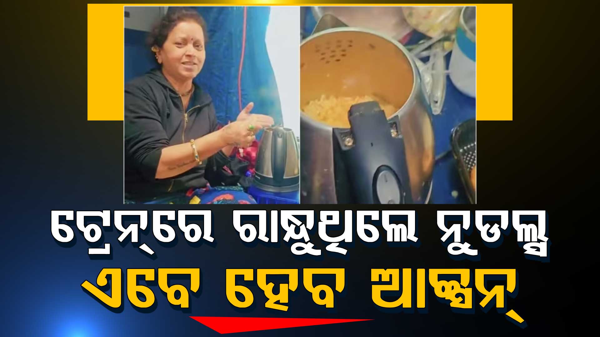 କୌଣସି ଏକ ଏକ୍ସପ୍ରେସ୍ ଟ୍ରେନ୍ର ଏସି କୋଚ୍ରେ ମହିଳା ଜଣଙ୍କ ଇଲେକ୍ଟ୍ରିକ୍ କେଟିଲ୍ ବୋର୍ଡର ସକେଟ୍ରେ ଲଗାଇଛନ୍ତି । ଟ୍ରେନ୍ ଯାତ୍ରା ବେଳେ ସେ ସେଥିରେ ନୁଡଲ୍ସ ରାନ୍ଧିବାରେ ଲାଗିଛନ୍ତି ।