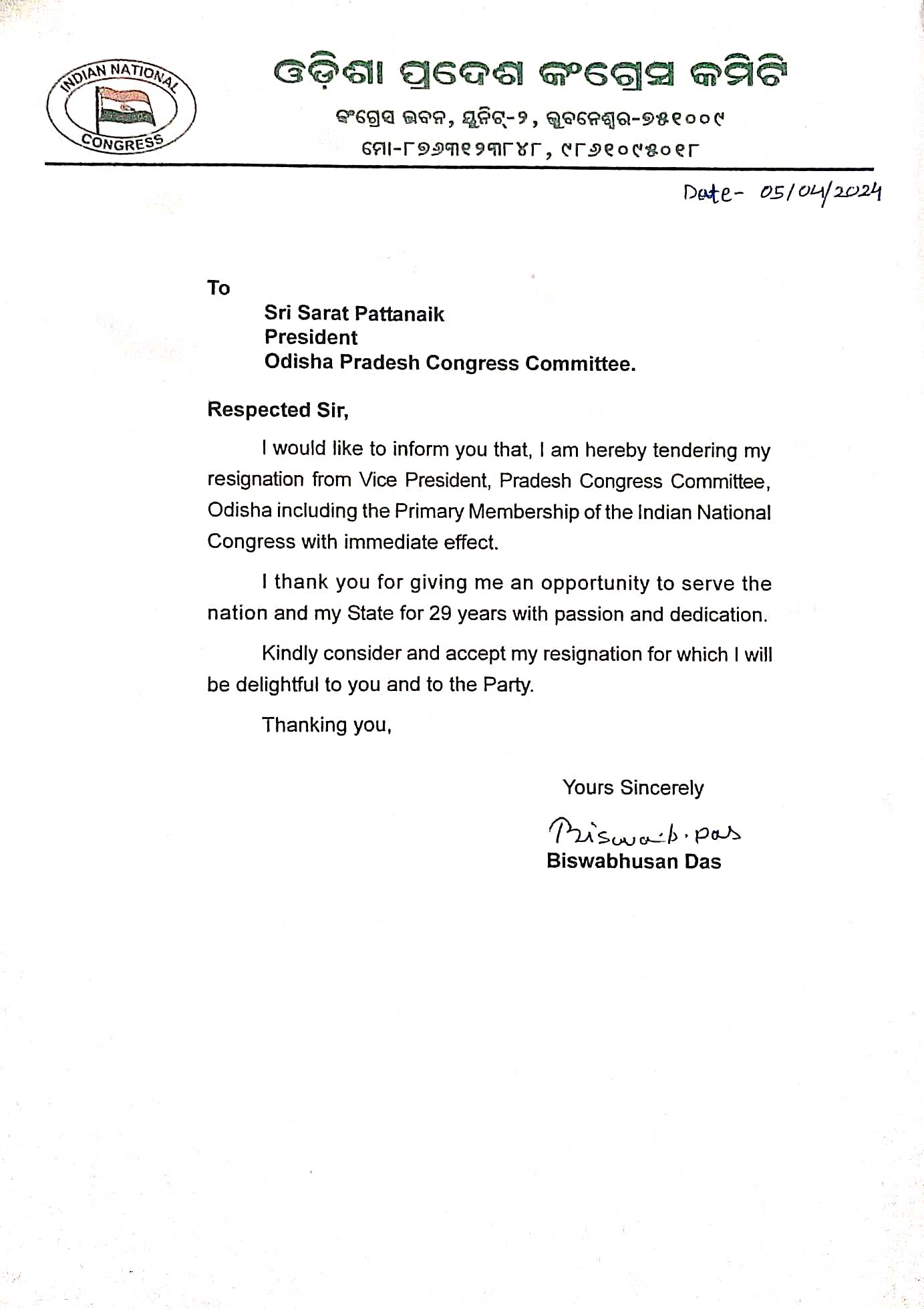 Bhubaneswar, Apr 5: In a major jolt to the Congress party in Odisha, state unit vice president Biswabhusan Das resigned from primary membership of the party ahead of elections on Friday.