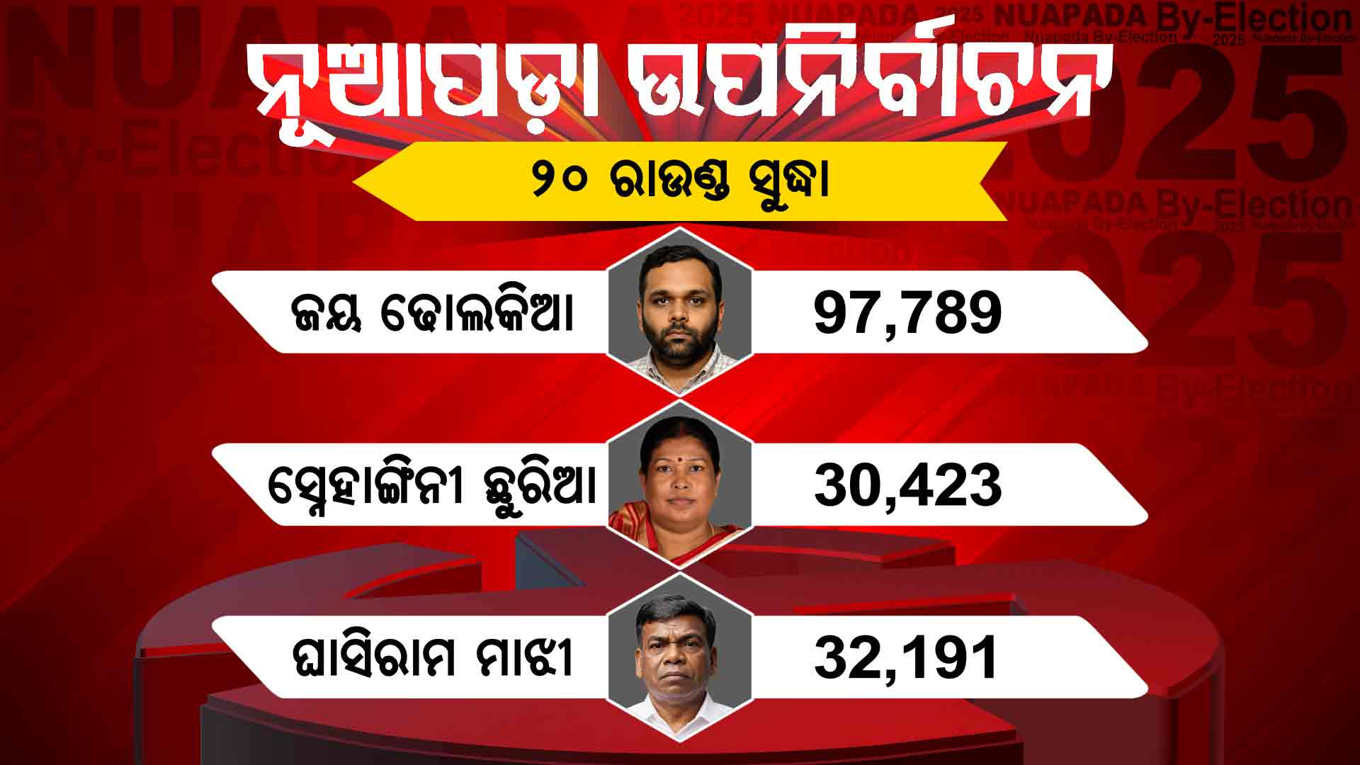 ସେପଟେ ପ୍ରକାଶ ପାଇଛି ୨୦ ରାଉଣ୍ଡ ଭୋଟ ଗଣତି ଫଳାଫଳ । ୨୦ତମ ରାଉଣ୍ଡ ଗଣତି ସୁଦ୍ଧା ବିଜେପି ପ୍ରାର୍ଥୀ ଜୟ ଢୋଲକିଆ ୬୫,୫୯୮ ଭୋଟରେ ଆଗୁଆ ଅଛନ୍ତି । ୯୭,୭୮୯ ଟି ଭୋଟ୍ ପାଇଥିବାବେଳେ କଂଗ୍ରେସ ପ୍ରାର୍ଥୀ ଘାସିରାମ ମାଝୀଙ୍କୁ ମିଳିଛି ୩୨,୧୯୧ ଭୋଟ୍ । ବିଜେଡି ପ୍ରାର୍ଥୀ ସ୍ନେହାଙ୍ଗିନୀ ଛୁରିଆଙ୍କୁ ମିଳିଛି ୩୦,୪୨୩ ଭୋଟ୍। ବିଜେଡିକୁ ପଛରେ ପକାଇ ଆଗରେ କଂଗ୍ରେସ। ରାଜ୍ୟରେ ଧିରେ ଧିରେ କମୁଛି ବିଜେଡିର କ୍ରେଜ।