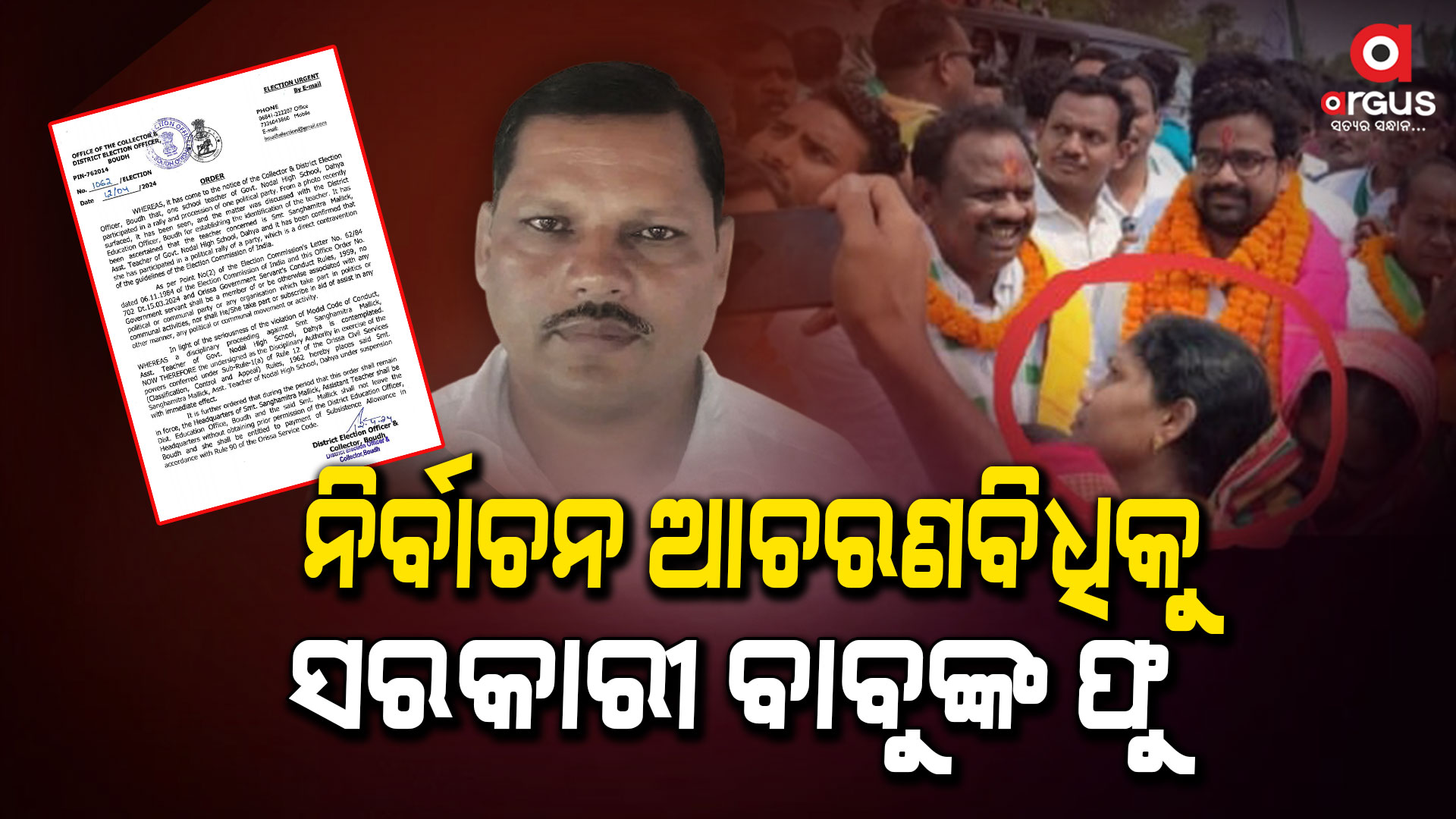 ବୌଦ୍ଧରୁ ଆସିଲା ସଙ୍ଗୀନ ଚିତ୍ର । ସରକାରୀ ଚାକିରି କରିଥିବା ପରେ ବି ଦଳୀୟ ପାଇଁ କରୁଛନ୍ତି କାମ । ତଦନ୍ତ ହେବା ପରେ ସଂପୃକ୍ତ ଶିକ୍ଷକଙ୍କ ବିରୋଧରେ ଜିଲ୍ଲା ନିର୍ବାଚନ ଅଧିକାରୀ କାର୍ଯ୍ୟାନୁଷ୍ଠାନ ଗ୍ରହଣ କରିଛନ୍ତି । ଜିଲ୍ଲା ଶିକ୍ଷା ଅଧିକାରୀଙ୍କ କାର୍ଯ୍ୟାଳୟ ପକ୍ଷରୁ ମିଳିଥିବା ସୂଚନା ଅନୁଯାୟୀ, ନିର୍ବାଚନ ଅଧିକାରୀଙ୍କ ନିର୍ଦ୍ଦେଶକ୍ରମେ ରାଜନୀତିରେ ସମ୍ପୃକ୍ତି ଥିବା ଅଭିଯୋଗରେ ଆଦିବାସୀ ହାଇସ୍କୁଲର ଶିକ୍ଷକ ଗୋବର୍ଦ୍ଧନ ପ୍ରଧାନଙ୍କ ବଦଳି ହୋଇଛି।