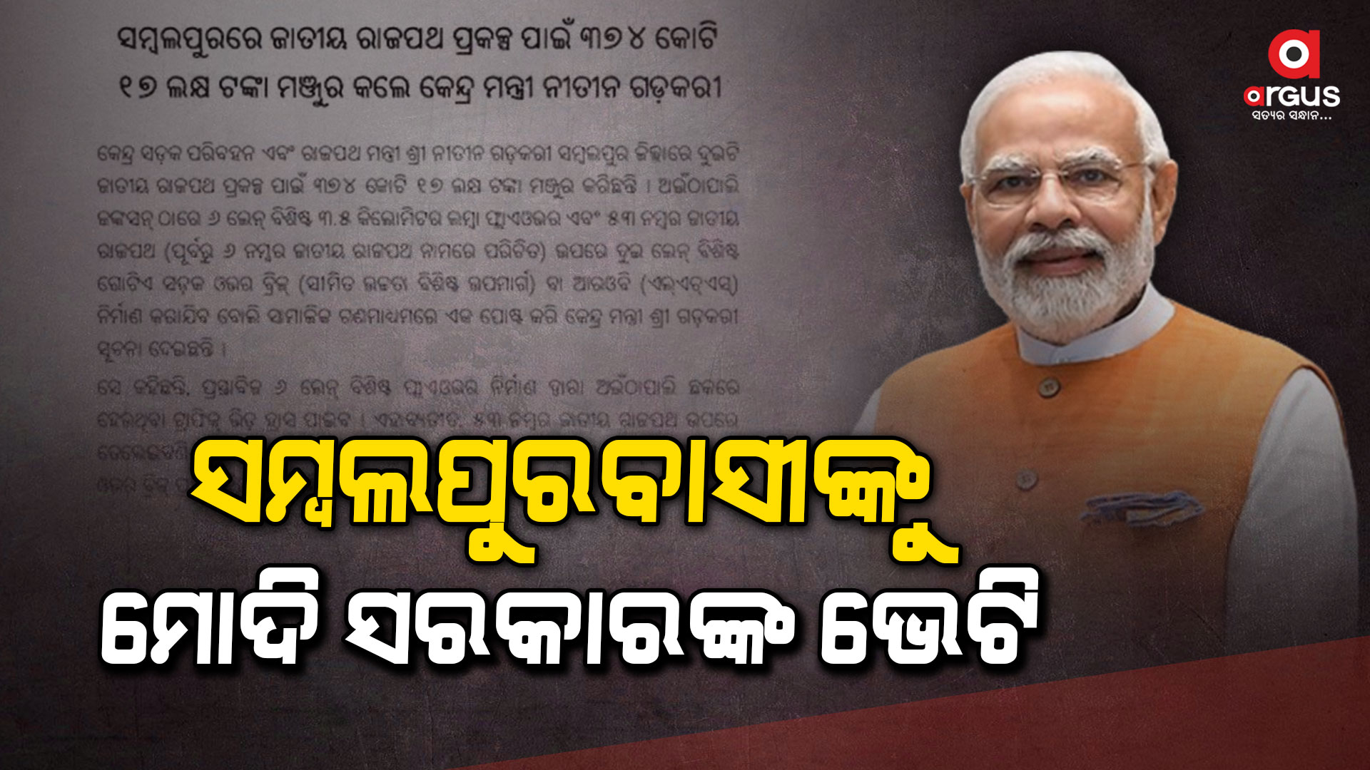 ଅର୍ଗସ ବ୍ୟୁରୋ: ସମ୍ବଲପୁରବାସୀଙ୍କୁ ମୋଦି ସରକାରଙ୍କ ଭେଟି। ସମ୍ବଲପୁରରେ ଜାତୀୟ ରାଜପଥ ପ୍ରକଳ୍ପ ପାଇଁ 374 କୋଟି 17 ଲକ୍ଷ ଟଙ୍କା ମଞ୍ଜୁର କଲେ କେନ୍ଦ୍ର ସଡ଼କ ପରିବହନ ଏବଂ ରାଜପଥ ମନ୍ତ୍ରୀ ନୀତୀନ ଗଡକରୀ। ସମ୍ବଲପୁର ଜିଲ୍ଲାରେ ଦୁଇଟି ଜାତୀୟ ରାଜପଥ ପ୍ରକଳ୍ପ ପାଇଁ ୩୭୪ କୋଟି ୧୭ ଲକ୍ଷ ଟଙ୍କା ମଞ୍ଜୁର ହୋଇଛି। ଅଇଁଠାପାଲି ଜଙ୍କସନ୍ ଠାରେ ୬ ଲେନ୍ ବିଶିଷ୍ଟ ସାଢ଼େ ତିନି କିଲୋମିଟର ଲମ୍ଵା ଫ୍ଲାଏଓଭର ଏବଂ ୫୩ ନମ୍ବର ଜାତୀୟ ରାଜପଥ ଉପରେ ଦୁଇ ଲେନ୍ ବିଶିଷ୍ଟ ଗୋଟିଏ ସଡ଼କ ଓଭର ବ୍ରିଜ୍ ବା ଆରଓବି ନିର୍ମାଣ କରାଯିବ।