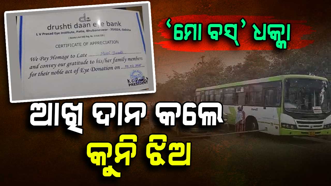 ଆଖି ଦାନ କଲେ 'ମୋ ବସ୍' ଦୁର୍ଘଟଣାରେ ପ୍ରାଣ ହରେଇଥିବା କୁନି ଝିଅ । ଭୁବନେଶ୍ବର ନନ୍ଦନକାନନ ଥାନା ରଘୁନାଥପୁରରେ ଜଣେ ଷଷ୍ଠ ଶ୍ରେଣୀର ଛାତ୍ରୀଙ୍କ ଉପରେ ଚଢ଼ିଯାଇଥିଲା ମୋ ବସ୍ । ଘଟଣାସ୍ଥଳରେ ହିଁ କୁନି ଝିଅ ମୁନି ଜୁଆଡ଼ିଙ୍କ ମୃତ୍ୟୁ ହୋଇଥିଲା । ଝିଅର ଆଖି ଦାନ କଲେ ପରିବାର ଲୋକେ। ଦୁର୍ଘଟଣା ଘଟାଇଥିବା ଡ୍ରାଇଭରକୁ ଗିରଫ କରିଛି ପୋଲିସ । ରାସ୍ତା ଅତିକ୍ରମ କରୁଥିବା ବେଳେ ହଠାତ୍ ମାଡ଼ି ଆସିଥିଲା 'ମୋ ବସ୍' ।
