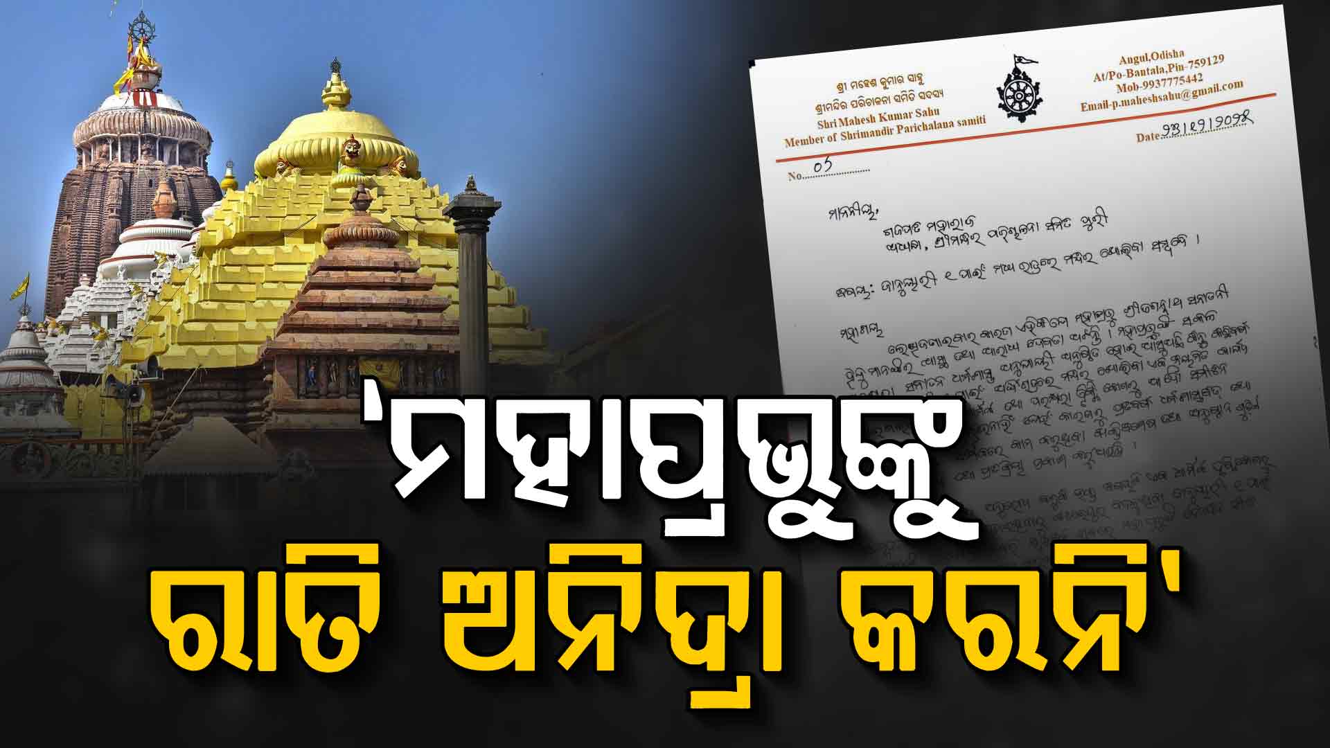 କିଛି ବର୍ଷ ହେବ ଡିସେମ୍ବର ୩୧ ତାରିଖ ମଧ୍ୟରାତ୍ରରୁ ଭକ୍ତଙ୍କ ଦର୍ଶନ ହେଉଥିବା ବେଳେ ମହାପ୍ରଭୁଙ୍କୁ ମଧ୍ୟ ରାତ୍ରି ଅନିଦ୍ରା ରଖାଯାଉଛି । ଯାହାକି ଧାର୍ମିକ ତଥା ପରମ୍ପରା ଦୃଷ୍ଟିକୋଣରୁ ଆଦୌ ସମୀଚିନ ଅନୁଭବ ହେଉନାହିଁ ବୋଲି ଚିଠିରେ ଉଲ୍ଲେଖ କରିଛନ୍ତି ପଣ୍ଡିତ ମହେଶ ସାହୁ । ତେଣୁ ଜାନୁଆରୀ ୧ ତାରିଖ ପାଇଁ ମହାପ୍ରଭୁଙ୍କୁ ରାତି ଅନିଦ୍ରା ନକରି ସ୍ୱଭାବିକ୍ ଭାବେ ମହାପ୍ରଭୁଙ୍କ ଦୈନନ୍ଦିନ ନୀତିକାନ୍ତି ଅନୁଷ୍ଠିତ କରିବାକୁ ଶ୍ରୀମନ୍ଦିର ମୁଖ୍ୟ ପ୍ରଶାସକ, ଗଜପତି ମହାରାଜା ଓ ଆଇନମନ୍ତ୍ରୀଙ୍କୁ ଚିଠି ଲେଖିଛନ୍ତି ପରିଚାଳନା କମିଟିର ସଦସ୍ୟ ପଣ୍ଡିତ ମହେଶ ସାହୁ । ସେପଟେ ମହେଶ ସାହୁଙ୍କ ଏଭଳି ପ୍ରସଙ୍ଗକୁ ସମର୍ଥନ ଜଣାଇଛନ୍ତି ଉଭୟ ଭକ୍ତ ଏବଂ ସେବାୟତ ।