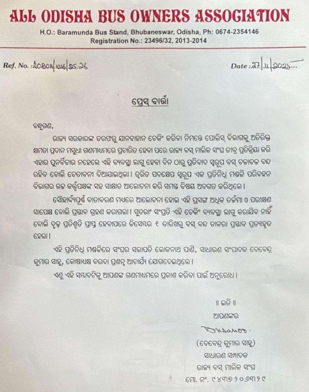 ନିକଟରେ ରାଜ୍ୟରେ ଗାଡ଼ି ଚେକିଂ ପାଇଁ ପୋଲିସକୁ ଅତିରିକ୍ତ କ୍ଷମତା ପ୍ରଦାନ ନେଇ ଖବର ଆସିଥିଲା । ଏହି ଖବର ପରେ ତୀବ୍ର ପ୍ରତିକ୍ରିୟା ପ୍ରକାଶ ସହ ଏହାର ପୁନର୍ବିଚାର ନକଲେ ବ୍ୟବସ୍ଥା ଲାଗୁ ଦିନ ଠାରୁ ପ୍ରତିବାଦ ସ୍ଵରୂପ ବସ୍ ଚଳାଚଳ ବନ୍ଦ କରିବାକୁ ସଂଘ ଚେତାବନୀ ଦେଇଥିଲା ।