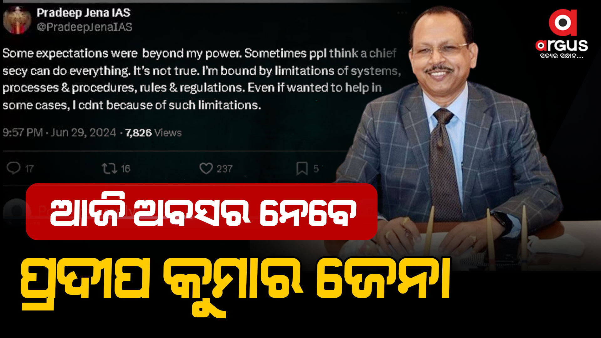 ଭୁବନେଶ୍ୱର: ଆଜି ଅବସର ନେଉଛନ୍ତି ମୁଖ୍ୟ ଶାସନ ସଚିବ ପ୍ରଦୀପ କୁମାର ଜେନା । ତେବେ ଅବସର ନେବା ପୂର୍ବରୁ ଭାବ ବିହ୍ବଳ ଟୁଇଟ ଆଗାମୀ ଦିନ ପାଇଁ ସେ ଲୋକଙ୍କ ଆଶିର୍ବାଦ କାମନା କରୁଛନ୍ତି । ଏକ୍ସ ହ୍ୟାଣ୍ଡେଲରେ ଲେଖିଛନ୍ତି, ମୁଁ ଜୀବନର ଏକ ନୂଆ ପର୍ଯ୍ୟାୟକୁ ପ୍ରବେଶ କରୁଥିବାରୁ ଜଣେ ସାଧାରଣ ଲୋକ ଭାବେ ଯେପରି ରାଜ୍ୟର ହିତ ପାଇଁ ସହଯୋଗ କରିପାରିବି ସେଥିପାଇଁ ଆପଣଙ୍କ ଆଶିର୍ବାଦ କାମନା କରୁଛି । ପ୍ରଦୀପ କହିଛନ୍ତି, ମୁଁ ସର୍ବଦା ସୀମା ଭିତରେ ରହି ପ୍ରତ୍ୟେକଙ୍କୁ ପ୍ରତିଉତ୍ତର ଦେଇଛି ।