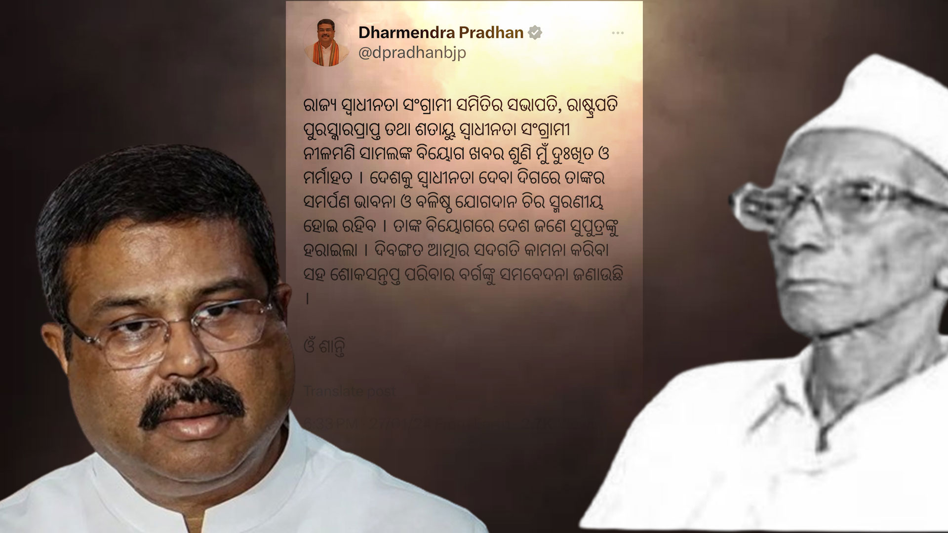 Bhubaneswar, Jan 27: Union Minister of Education and Skill Development & Entrepreneurship, Dharmendra Pradhan on Saturday expressed deep grief over the demise Odisha’s Centenarian Freedom Fighter Nilamani Samal.