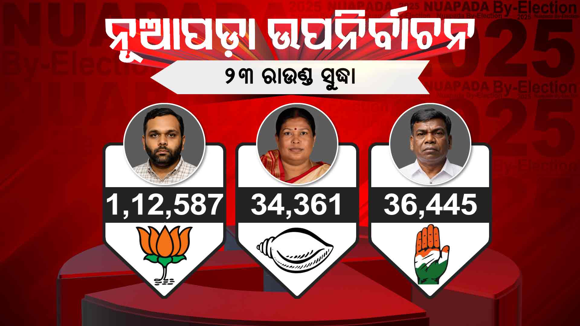 ୨୩ତମ ରାଉଣ୍ଡରେ ବିଜେପିର ଜୟ ଢୋଲକିଆଙ୍କୁ ୪ ହଜାର ୩୪୭ ଖଣ୍ଡ ଭୋଟ୍ ମିଳିଥିବା ବେଳେ କଂଗ୍ରେସର ଘାସିରାମ ମାଝୀଙ୍କୁ ୧୩୪୪ ଖଣ୍ଡ ଭୋଟ୍ ଓ ବିଜେଡିର ସ୍ନେହାଙ୍ଗିନୀ ଛୁରିଆଙ୍କୁ ମିଳିଛି ୧୨୭୩ ଖଣ୍ଡ ଭୋଟ୍ ।