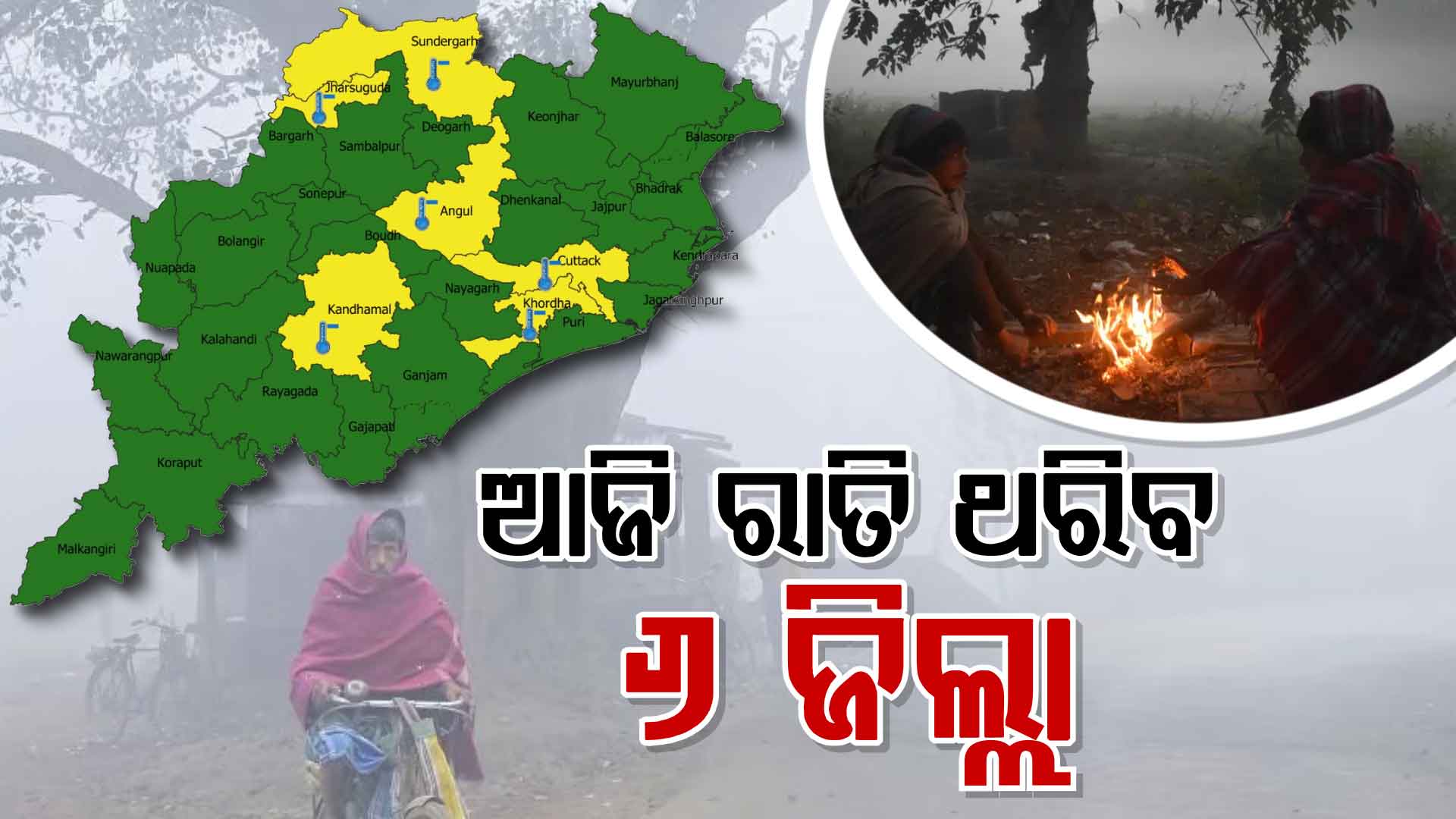 ପାହାନ୍ତିଆରେ ଘନ କୁହୁଡ଼ି, ରାତିରେ ହାଡ଼ଭଙ୍ଗା ଜାଡ଼ ଲୋକଙ୍କୁ ଅସ୍ତବ୍ୟସ୍ତ କରୁଛି । ଆଞ୍ଚଳିକ ପାଣିପାଗ ବିଜ୍ଞାନ କେନ୍ଦ୍ରର ଆକଳନ କହୁଛି, ଆଜି ରାତି ବି ଶୀତ ପଡ଼ିବ । ଏନେଇ ୬ ଜିଲ୍ଲାକୁ ୟେଲୋ ୱାର୍ଣ୍ଣିଂ ଦିଆଯାଇଛି ।